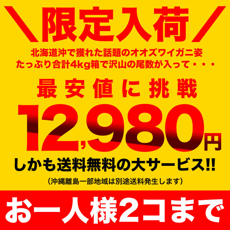 トップ > かに > ズワイガニ > ズワイガニ(足・姿) > 【在庫限り/お一人様2コまで】北海道産 オオ ズワイガニ 姿 12〜14尾入(入数選択不可)合計4kg前後 オオズワイガニ カニ 蟹 かに パーティー【のし不可】